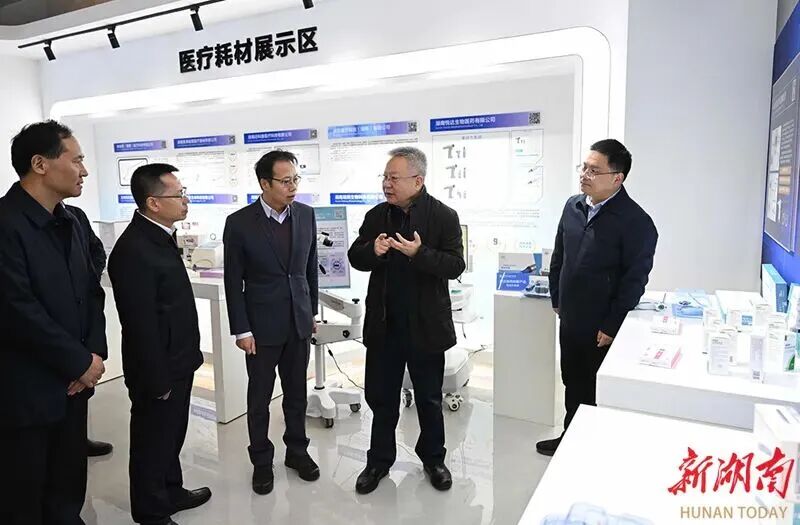 在位于湘潭经开区的湖南省医疗器械产业园,沈晓明详细了解园区产业集聚发展和企业研发经营等情况,指出要深化园区专业化、市场化改革,不断提升服务水平和发展质效。