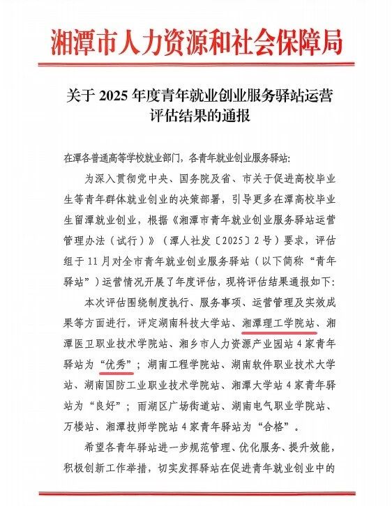 近日,湘潭市人力资源和社会保障局公布了2025年度青年就业创业服务驿站运营评估结果。在综合评估中,湘潭理工学院大学生就业指导中心运营的湘潭市青年就业创业服务驿站湘潭理工学院站(以下简称“青年驿站”)获评“优秀”等级。