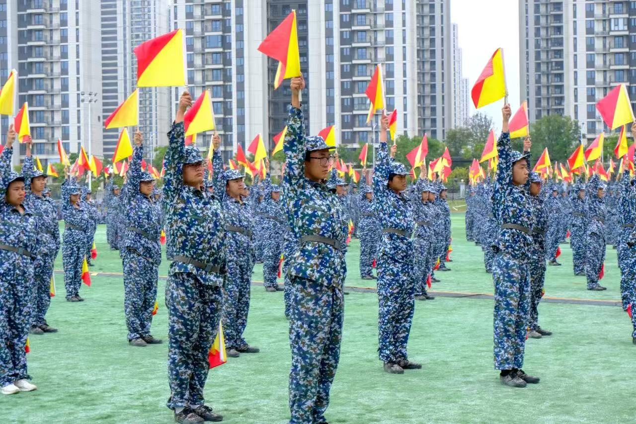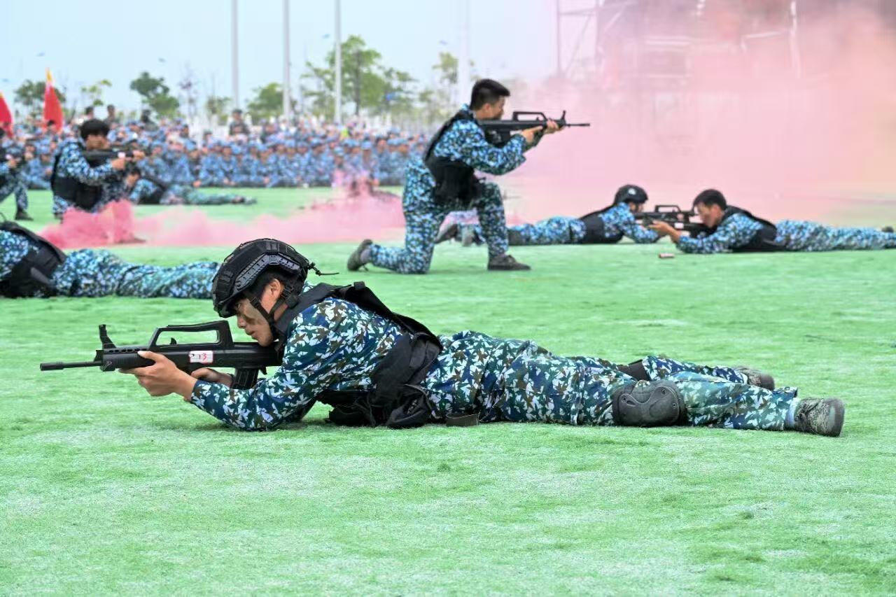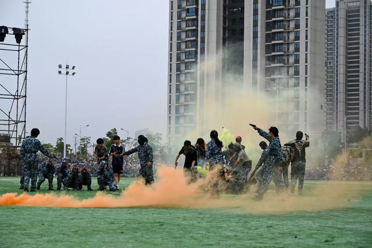 随后的军训成果汇报表演中,各方阵依次登场,展现出昂扬风貌:队列方阵步伐整齐;军体拳方阵刚劲有力;军语旗方阵令行一致;匕首操方阵动作凌厉;防爆战术方阵尽显力量;特别增设的八段锦方阵将传统文化元素融入军训,其动作柔和缓慢、圆活连贯,成为全场亮点。