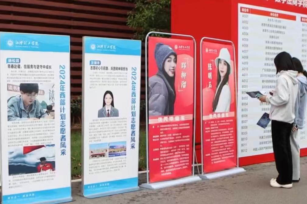 现场还精心布置了三大展示区,分别呈现产教融合成果、优秀毕业生风采、西部计划志愿者事迹,集中展示了学校的办学特色和育人成效,吸引了众多求职者驻足观看。